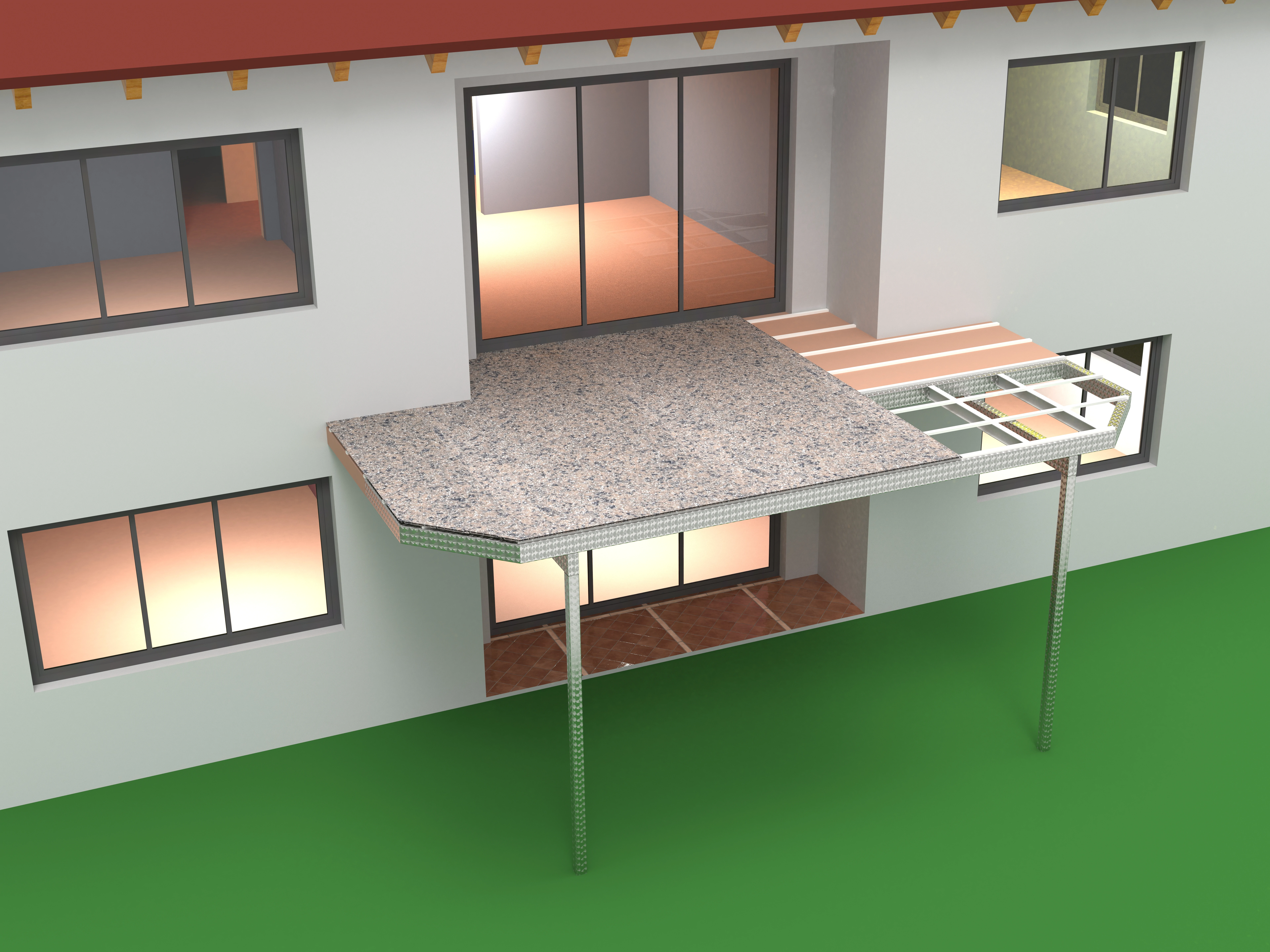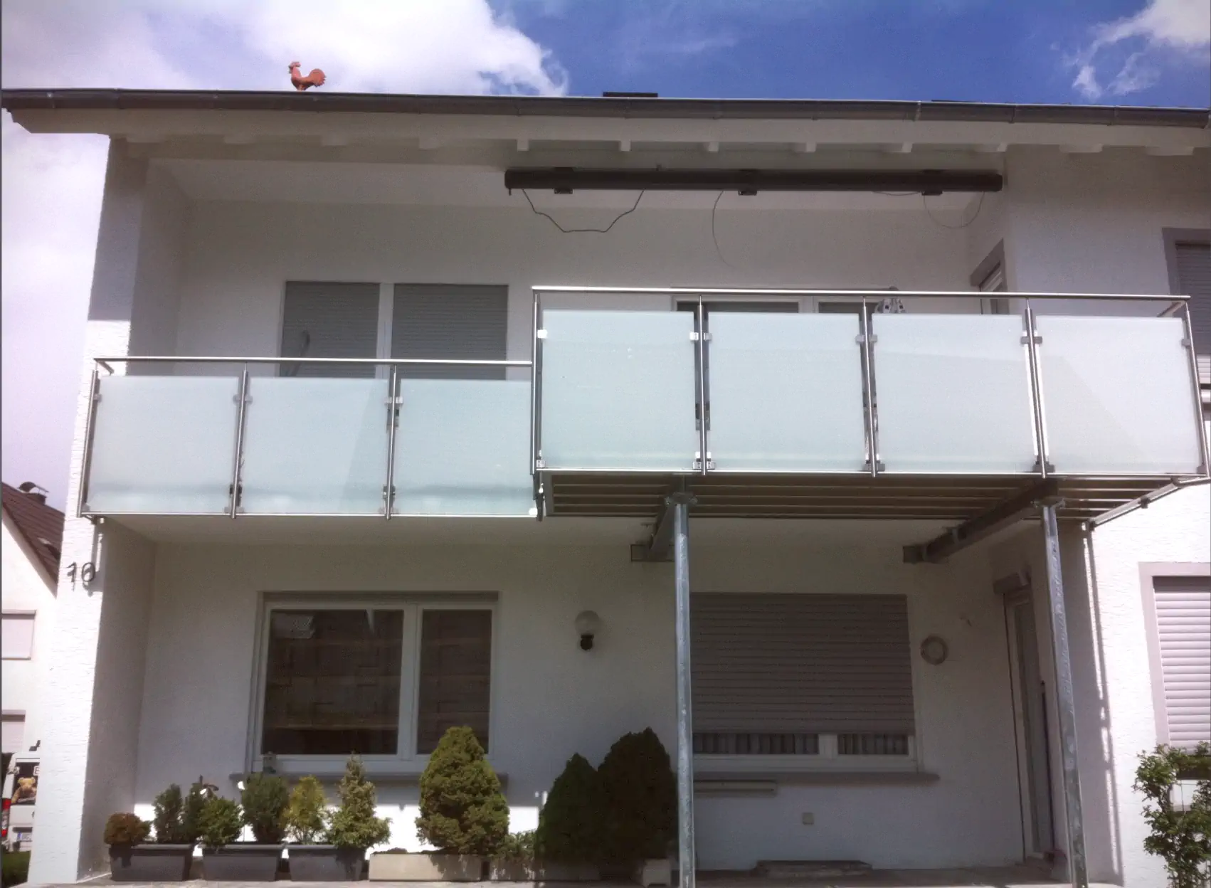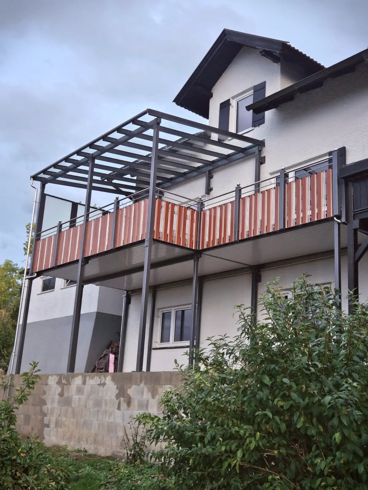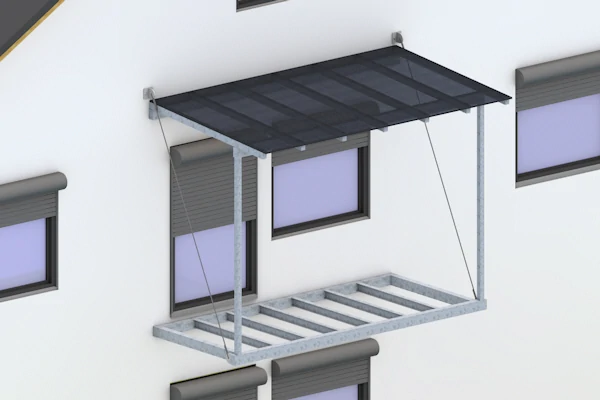 Die Konstruktion erfolgt über zugelassene Wandanker oder wird mithilfe von Zugstangen an der oberen Geschossdecke abgehängt. So entsteht ein optisch freier Raum unter dem Balkon, der sich besonders für Hauseingänge, Einfahrten oder kleinere Gärten eignet.