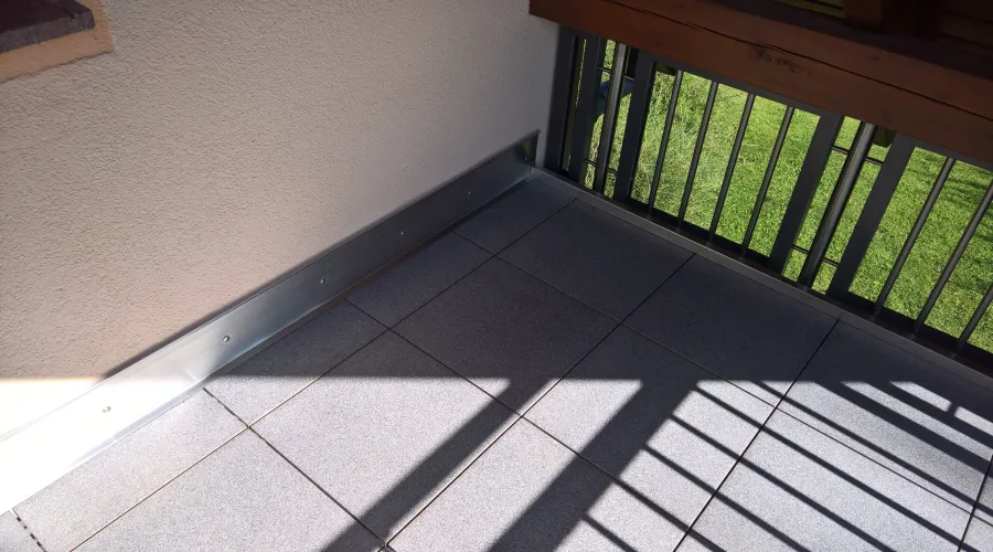 Anschlagschiene am Geländer ermöglich dem Wasser einen ungehinderten Ablauf unter den Belagsplatten in die Wasserrinne oder übers Tropfblech.